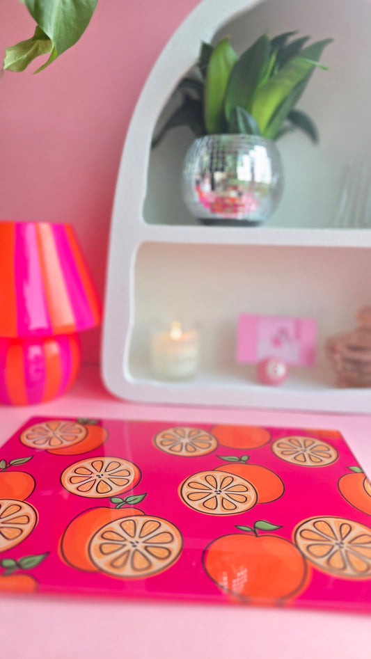 Fruity Oranges On Pink Glass Chopping Board