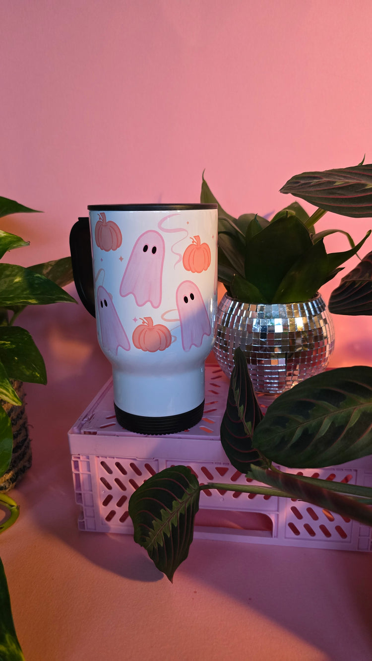 Cute Pink Ghost & Pumpkin Travel Mug